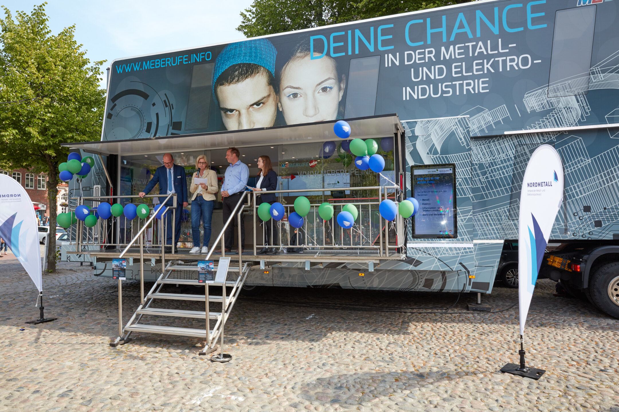 Berufsinformationstruck auf dem Marktplatz von Burg auf Fehmarn. Mit dem Bürgermeister Jörg Weber